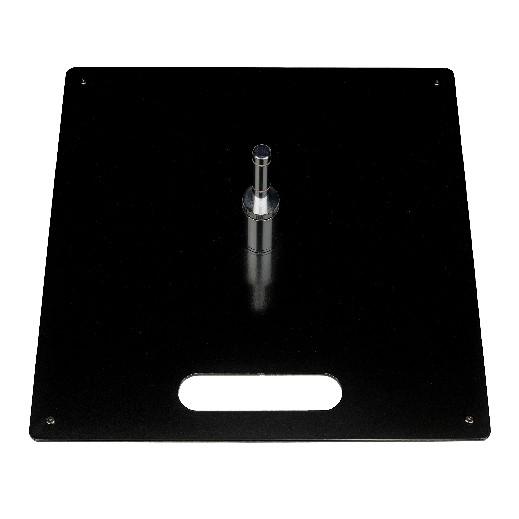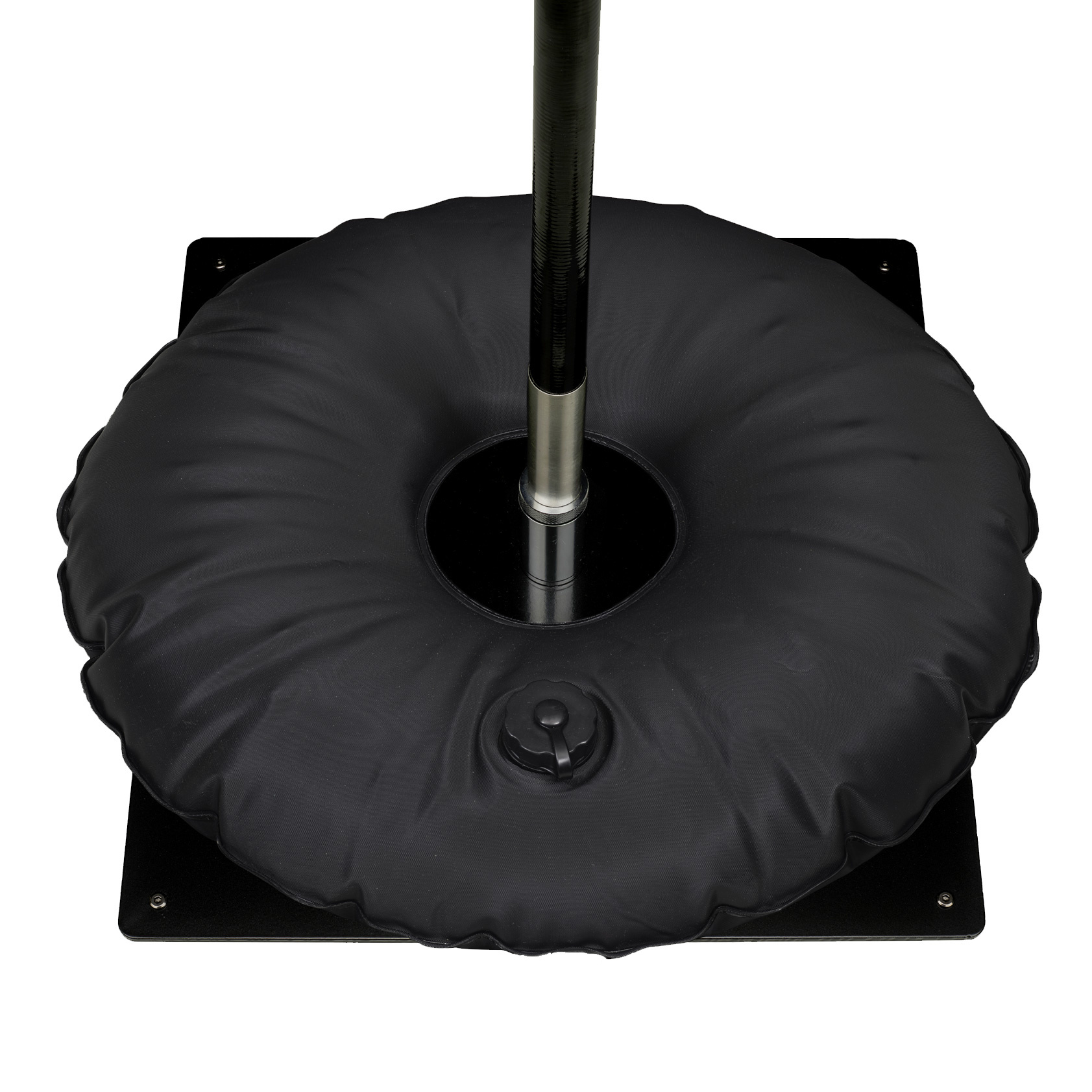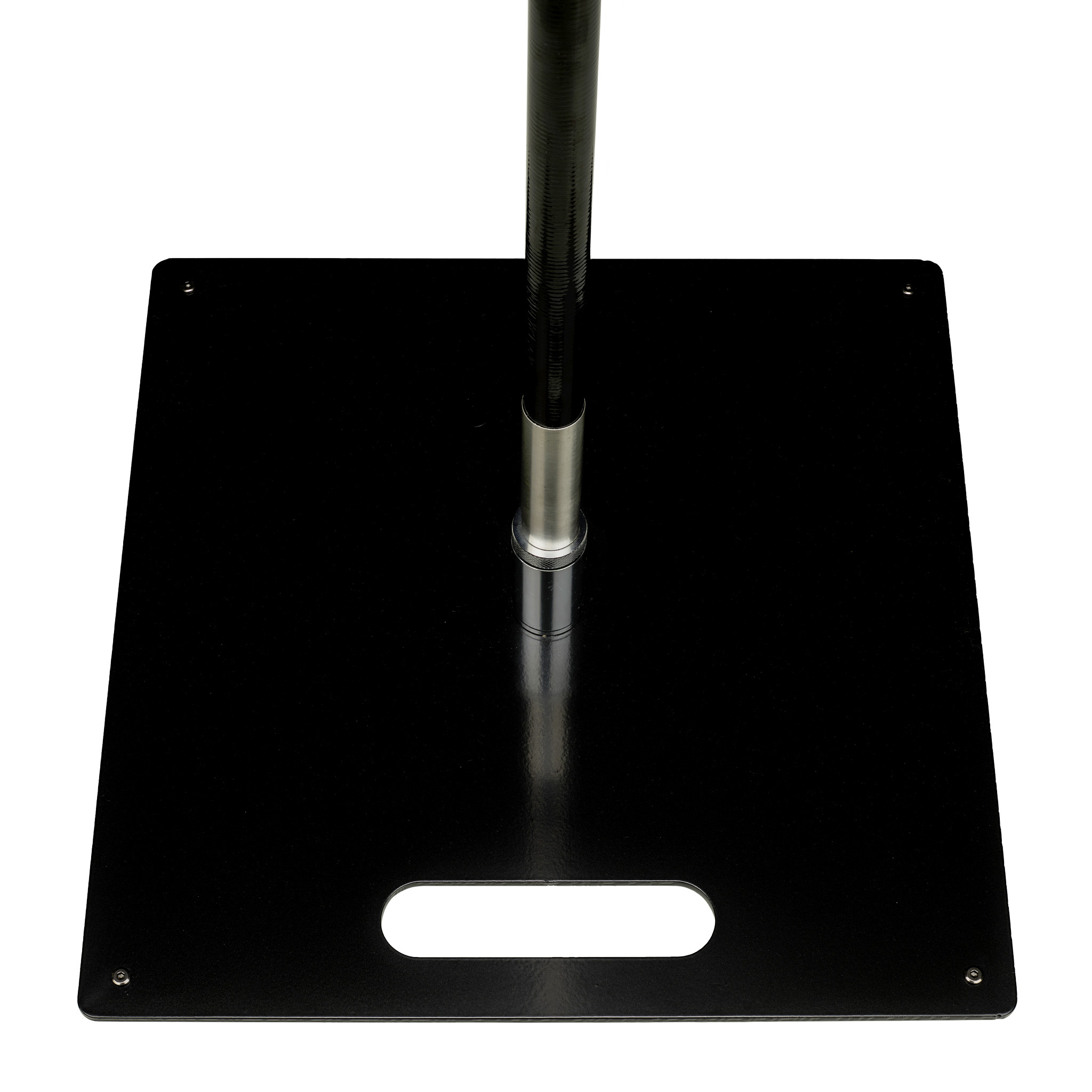 Zwarte grondplaat met pin. De gelagerde pin zorgt ervoor dat de mast meedraait met de wind en uw vlag beter zichtbaar is. De pin is op twee punten bevestigd aan de grondplaat. Hierdoor kan de pin niet losdraaien. De ideale voet voor harde ondergronden. Zowel binnen als buiten te gebruiken.